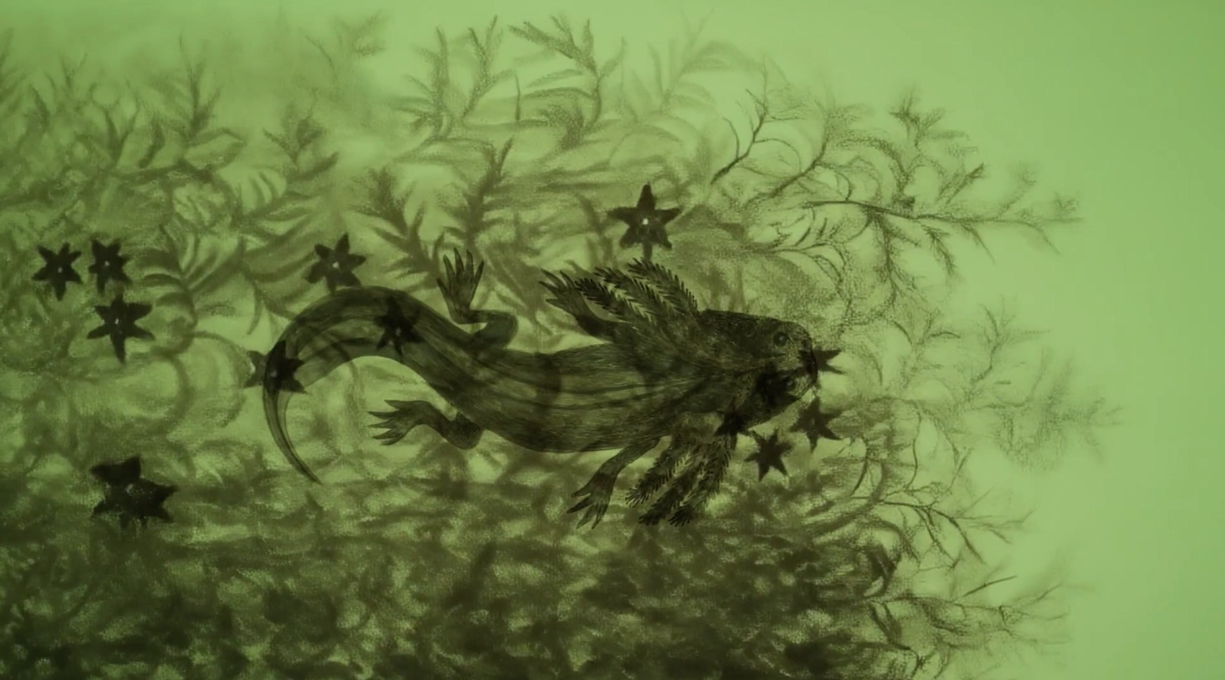 Smith is intrigued by axolotls as surface: as a site of negotiation from the membranes, between the internal and the external, between different scales, as a projection screen that inevitably eludes any fixed identity. With this exhibition, Smith proposes an animation that speculates on a world where axolotls float beyond