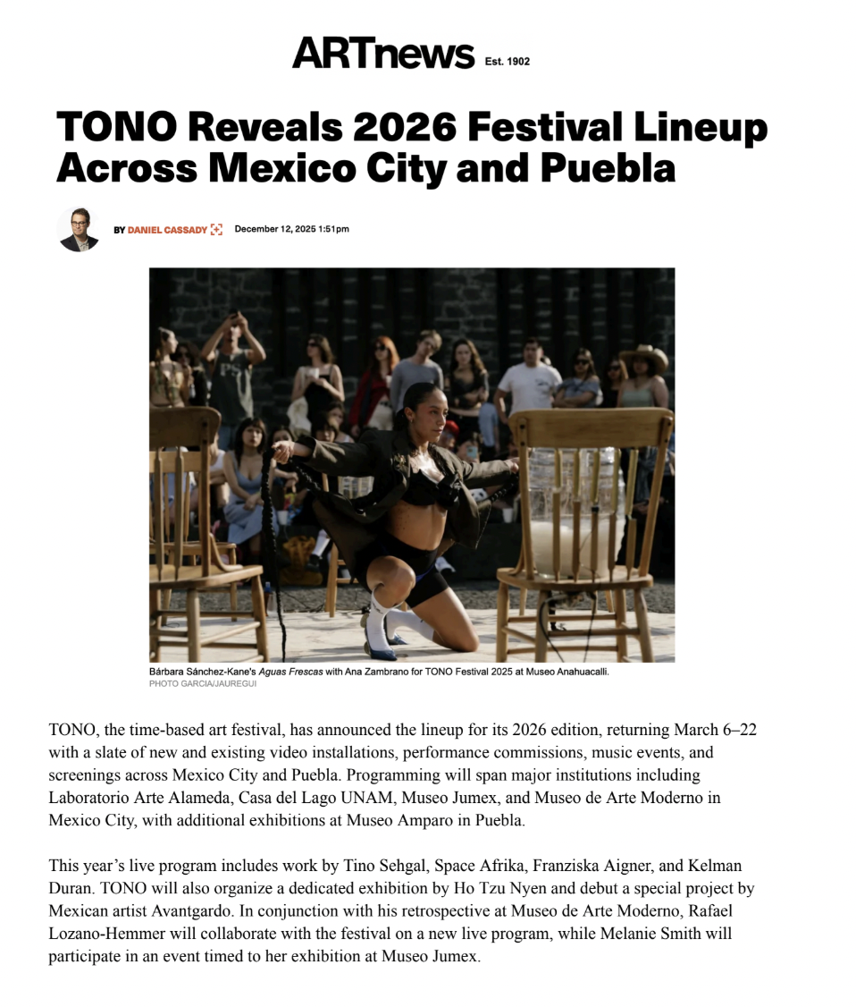 TONO thanks the Rosenkranz Foundation, Dance Reflections by Van Cleef & Arpels, Benny Gross, Lisa Milton and C3 Residency, Marian Goodman Gallery, the Judelson Family Foundation, and Baldassarre Ruspoli and 99 Canal for their support and dedication to TONO 2026. We thank the Friends of TONO. We are grateful for the leadership of our board – Lisa Milton, Enrique Norten, and Sam Ozer. We thank Kunsthalle Bangkok’s moving-image curator Rosalia Namsai Engchuan for her beautiful project and Kunsthalle Bangkok Director Stefano Rabolli Pansera for his dear collaboration on our joint screening programs across Mexico and Thailand. We thank all of our museum partners and close collaborators, including Valentina García Burgos, María Fernanda Ríos Almela and their team at Museo Casa Estudio Diego Rivera y Frida Kahlo; Kit Hammonds, Rosela Del Bosque, Ruth Ovseyevitz and their team at Museo Jumex; Cinthya García Leyva, Jean Pierre Espinosa López, and their team at Casa del Lago UNAM; Sol Henaro Palomino, Abril Castro-Prieto, Karol Wolley Reyes, Miguel Lopes and their team at Museo Universitario del Chopo UNAM; María del Sol Argüelles and her team at Museo de Arte Moderno; Maria Muñoz and her team at La Laguna Bodega, and Ramiro Martínez Estrada and Sergio Flores Martínez and their team at Museo Amparo. We thank C3 Residency and Wynwood for housing our artists and friends. We thank the Secretaría de Cultura del Gobierno de México and the Instituto Nacional de Bellas Artes y Literatura; as well as all of the technicians and installers involved in realizing the vision of TONO. We thank our assistant curator and producer Fabiola Garza Talavera for her dedication to the project. We thank our curatorial intern Alma Wirth for her work. Finally, we thank all the artists participating in TONO, for without them, none of this would be possible.